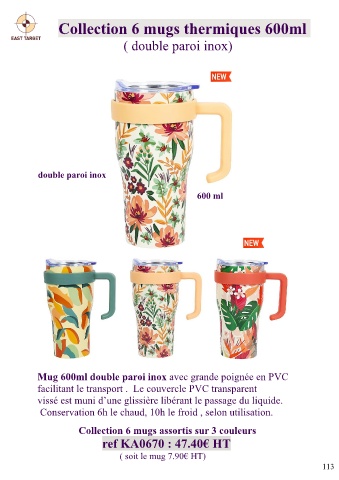 Mug 600ml double paroi inox avec grande poignée en PVC