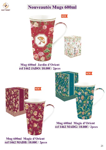 Nouveautés Mugs 600ml Mug 600ml Jardin d’Orient ref 1462 JADO: 10.00€ / 2pces Mug 600ml Magie d’Orient ref 1462 MADG: 10.00€ / 2pces Mug 600ml Magie d’Orient ref 1462 MADB: 10.00€ / 2pces 21