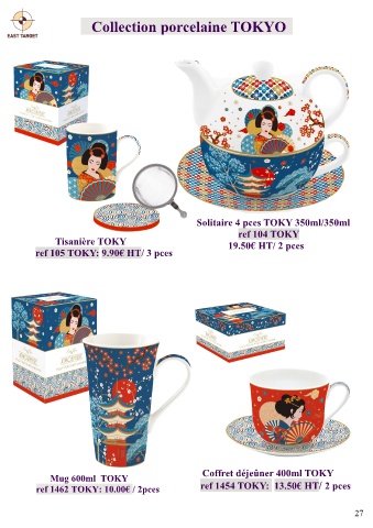 Collection porcelaine TOKYO Solitaire 4 pces TOKY 350ml/350ml ref 104 TOKY Tisanière TOKY 19.50€ HT/ 2 pces ref 105 TOKY: 9.90€ HT/ 3 pces Coffret déjeûner 400ml TOKY Mug 600ml TOKY ref 1454 TOKY: 13.50€ HT/ 2 pces ref 1462 TOKY: 10.00€ / 2pces 27