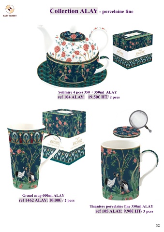 Collection ALAY - porcelaine fine Solitaire 4 pces 350 + 350ml ALAY ref 104 ALAY: 19.50€ HT/ 2 pces Grand mug 600ml ALAY ref 1462 ALAY: 10.00€ / 2 pces Tisanière porcelaine fine 350ml ALAY ref 105 ALAY: 9.90€ HT/ 3 pces 32