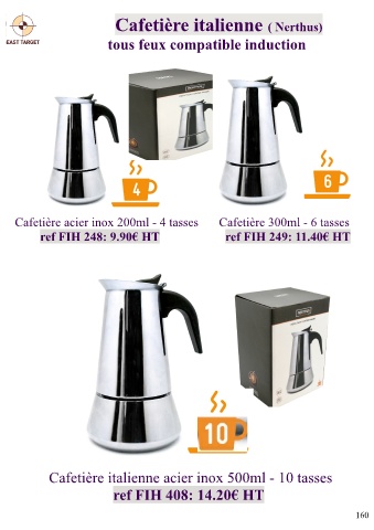 Cafetière italienne ( Nerthus) tous feux compatible induction Cafetière acier inox 200ml - 4 tasses Cafetière 300ml - 6 tasses ref FIH 248: 9.90€ HT ref FIH 249: 11.40€ HT Cafetière italienne acier inox 500ml - 10 tasses ref FIH 408: 14.20€ HT 160