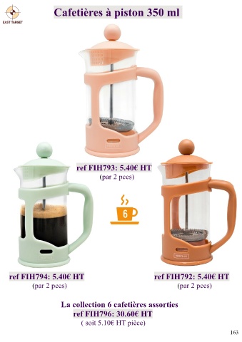 Cafetières à piston 350 ml ref FIH793: 5.40€ HT (par 2 pces) ref FIH794: 5.40€ HT ref FIH792: 5.40€ HT (par 2 pces) (par 2 pces) La collection 6 cafetières assorties ref FIH796: 30.60€ HT ( soit 5.10€ HT pièce) 163