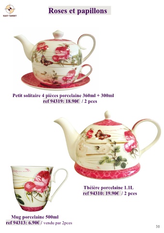 Roses et papillons Petit solitaire 4 pièces porcelaine 360ml + 300ml ref 94319: 18.90€ / 2 pces Théière porcelaine 1.1L ref 94310: 19.90€ / 2 pces Mug porcelaine 500ml ref 94313: 6.90€ / vendu par 2pces 31