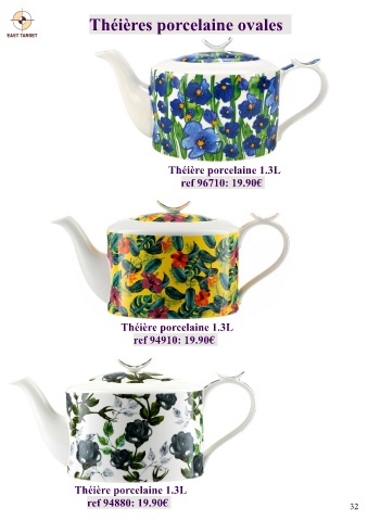 Théières porcelaine ovales Théière porcelaine 1.3L ref 96710: 19.90€ Théière porcelaine 1.3L ref 94910: 19.90€ Théière porcelaine 1.3L ref 94880: 19.90€ 32