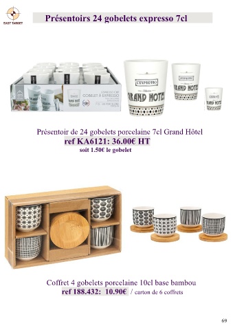 Présentoirs 24 gobelets expresso 7cl Présentoir de 24 gobelets porcelaine 7cl Grand Hôtel ref KA6121: 36.00€ HT soit 1.50€ le gobelet Coffret 4 gobelets porcelaine 10cl base bambou ref 188.432: 10.90€ / carton de 6 coffrets 69