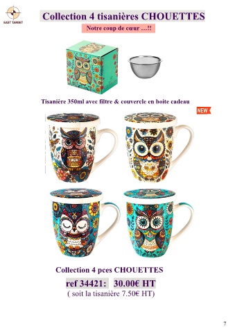 Collection 4 tisanières CHOUETTES Notre coup de cœur …!! Tisanière 350ml avec filtre & couvercle en boite cadeau Collection 4 pces CHOUETTES ref 34421: 30.00€ HT ( soit la tisanière 7.50€ HT) 7