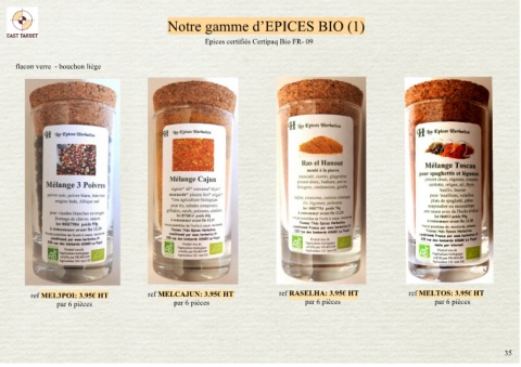 Notre gamme d’EPICES BIO (1) Epices certifiés Certipaq Bio FR- 09 flacon verre - bouchon liège ref MEL3POI: 3.95€ HT ref MELCAJUN: 3.95€ HT ref RASELHA: 3.95€ HT ref MELTOS: 3.95€ HT par 6 pièces par 6 pièces par 6 pièces par 6 pièces 35 11