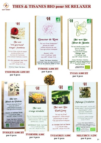 THES & TISANES BIO pour SE RELAXER TVROSE: 4.00€ HT TNOUFRAM: 4.05€ HT par 6 pces TVJAS: 4.00€ HT par 6 pces par 6 pces TVIOLET: 4.00€ HT par 6 pces TVORMIR: 4.00€ TVEAGREY: 4.00€ MELCIRCU: 4.25€ par 6 pces par 6 pces par 6 pces 19