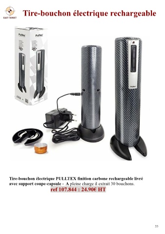 Tire-bouchon électrique rechargeable Tire-bouchon électrique PULLTEX finition carbone rechargeable livré avec support coupe-capsule - A pleine charge il extrait 30 bouchons. ref 107.844 : 24.90€ HT 33