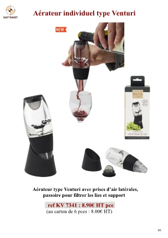 Aérateur individuel type Venturi Aérateur type Venturi avec prises d’air latérales, passoire pour filtrer les lies et support ref KV 7341 : 8.90€ HT pce (au carton de 6 pces : 8.00€ HT) 46