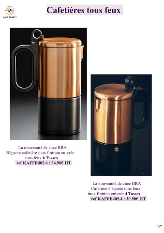 Cafetières tous feux La nouveauté de chez BRA Elégante cafetière inox finition cuivrée tous feux 6 Tasses ref KAFFE405.6 : 34.90€ HT La nouveauté de chez BRA Cafetière élégante tous feux inox finition cuivrée 4 Tasses ref KAFFE405.4 : 30.90€ HT 157