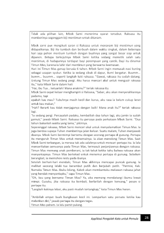 gemuk," jawab Mbok Sarni. Raksasa itu percaya pada perkataan Mbok Sarni. "Dua