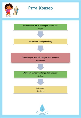 Peta Konsep Permasalahan air di kehidupan sehari-hari (Clues) Materi dan teori pendukung Penggabungan masalah dengan teori yang ada (Game Plan) Membuat gambar tentang pelestarian air (Solve) Kesimpulan (Reflect) iv