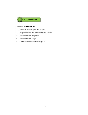 E. Tes Formatif Jawablah pertanyaan ini! 1. Jelaskan secara singkat dari aqiqah! 2. Bagaimana menurut anda tentang berqurban? 3. Sebutkan syarat berqurban! 4. Sebutkan syarat aqiqah! 5. Tulislah arti surah al-Kausar ayat 2! 224