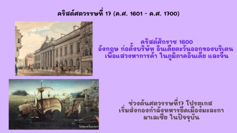 คริสต์ศตวรรษที 17 (ค.ศ. 1601 - ค.ศ. 1700) คริสต์ศักราช 1600 อังกฤษ ก่อตั งบริษัท อินเดียตะวันออกของบริเตน เพื อแสวงหาการค้า ในภูมิภาคอินเดีย และจีน ุ ช่วงต้นศตวรรษที 17 โปรตเกส เริ มส่งกองกําลังทหารยึดเมืองมะละกา ุ มาเลเซีย ในป จจบัน