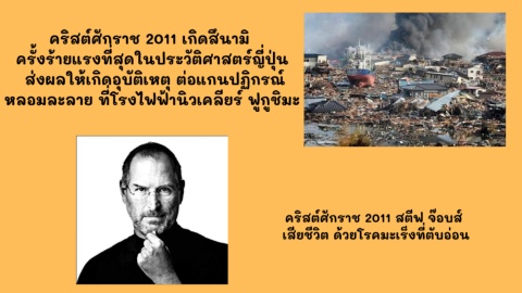 คริสต์ศักราช 2011 เกิดสึนามิ ครั งร้ายแรงที สดในประวัติศาสตร์ญี ปุ น ุ ุ ส่งผลให้เกิดอบัติเหตุ ต่อแกนปฏิกรณ์ ู หลอมละลาย ที โรงไฟฟ านิวเคลียร์ ฟูกชิมะ คริสต์ศักราช 2011 สตีฟ จ๊อบส์ เสียชีวิต ด้วยโรคมะเร็งที ตับอ่อน