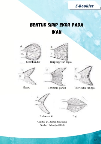 E-Booklet bentuk sirip ekor pada ikan Membundar Berpinggiran tegak Garpu Berlekuk ganda Berlekuk tunggal Bulan sabit Baji Gambar 24. Bentuk Sirip Ekor Sumber: Rahardjo (2020) 13