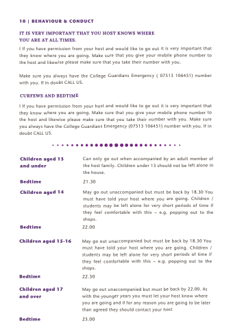 I If you have permission from your host and would like to go out it is very important that they know where you are going. Make sure that you give your mobile phone number to the host and likewise please make sure that you take their number with you. Make sure you always have the College Guardians Emergency (07513 106451) number with you. If in doubt CALL US.