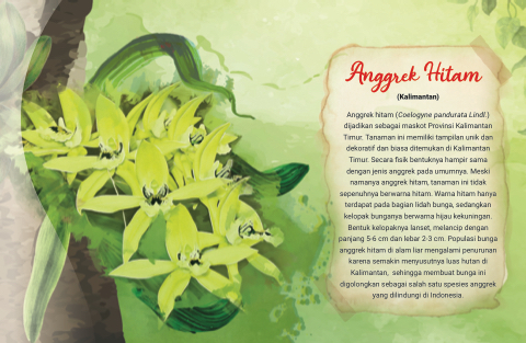 Anggrek hitam (Coelogyne pandurata Lindl.) dijadikan sebagai maskot Provinsi Kalimantan Timur. Tanaman ini memiliki tampilan unik dan dekoratif dan biasa ditemukan di Kalimantan Timur. Secara sik bentuknya hampir sama dengan jenis anggrek pada umumnya. Meski namanya anggrek hitam, tanaman ini tidak sepenuhnya berwarna hitam. Warna hitam hanya terdapat pada bagian lidah bunga, sedangkan kelopak bunganya berwarna hijau kekuningan. Bentuk kelopaknya lanset, melancip dengan panjang 5-6 cm dan lebar 2-3 cm. Populasi bunga anggrek hitam di alam liar mengalami penurunan karena semakin menyusutnya luas hutan di Kalimantan, sehingga membuat bunga ini digolongkan sebagai salah satu spesies anggrek yang dilindungi di Indonesia.