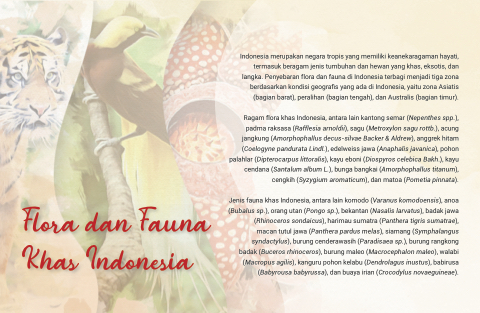 Indonesia merupakan negara tropis yang memiliki keanekaragaman hayati, termasuk beragam jenis tumbuhan dan hewan yang khas, eksotis, dan langka. Penyebaran flora dan fauna di Indonesia terbagi menjadi tiga zona berdasarkan kondisi geogra s yang ada di Indonesia, yaitu zona Asiatis (bagian barat), peralihan (bagian tengah), dan Australis (bagian timur).