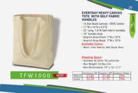 29 EVERYDAY HEAVY CANVAS TOTE WITH SELF FABRIC ns v Ct/aa tnC oo HANDLES TFW1000 Natural Distributors’ NET Suppliers’ NET Suppliers’ Margin 25% $1.85 $1.39 Colors $2.29 $1.72 25%