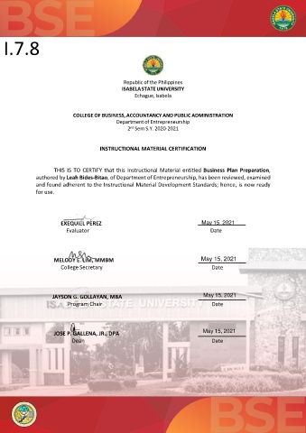 THIS IS TO CERTIFY that this Instructional Material entitled Business Plan Preparation,