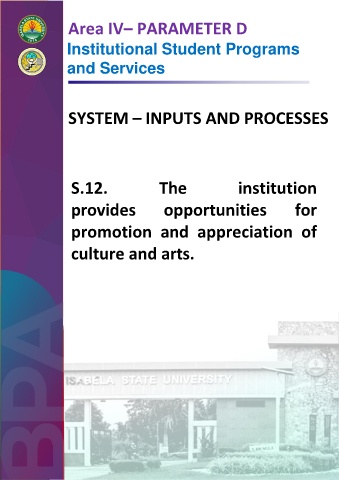 Area IV– PARAMETER D Institutional Student Programs and Services SYSTEM – INPUTS AND PROCESSES S.12. The institution provides opportunities for promotion and appreciation of culture and arts.