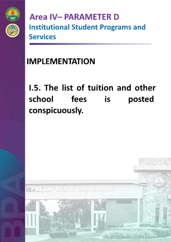 Area IV– PARAMETER D Institutional Student Programs and Services IMPLEMENTATION I.5. The list of tuition and other school fees is posted conspicuously.