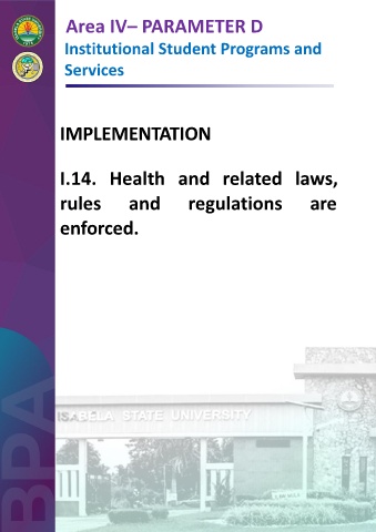Area IV– PARAMETER D Institutional Student Programs and Services IMPLEMENTATION I.14. Health and related laws, rules and regulations are enforced.
