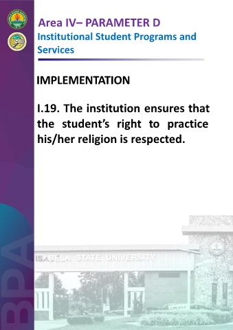 Area IV– PARAMETER D Institutional Student Programs and Services IMPLEMENTATION I.19. The institution ensures that the student’s right to practice his/her religion is respected.