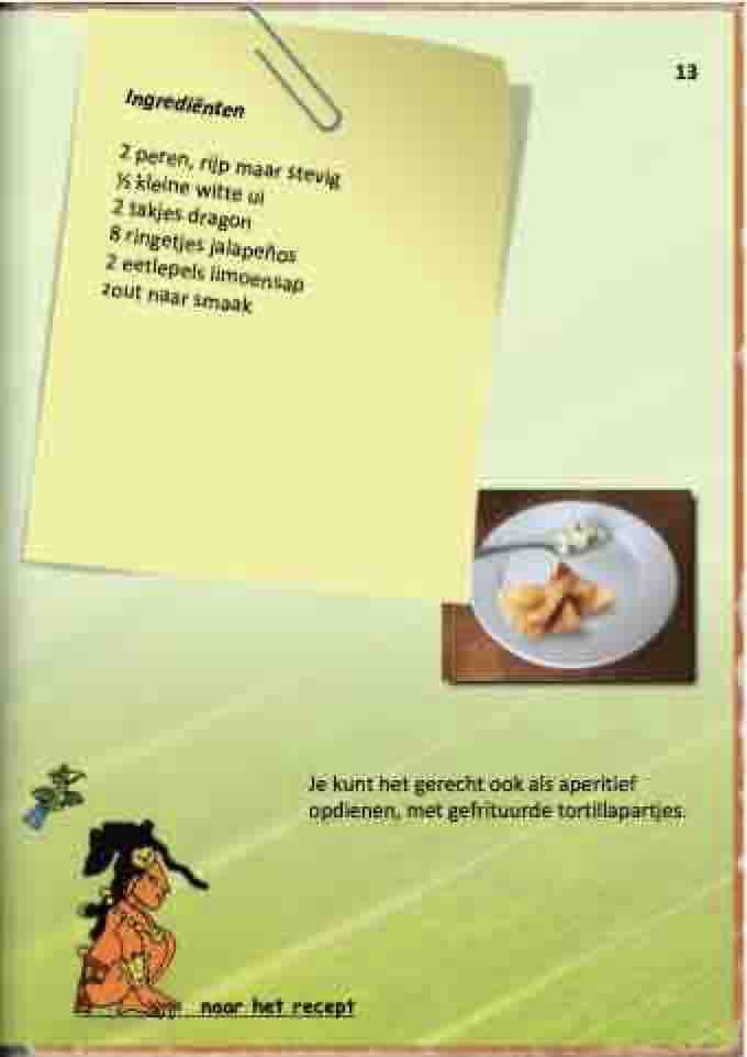 13 Je kunt het gerecht ook als aperitief opdienen, met gefrituurde tortillapartjes. naar het recept Ingrediënten 2 peren, rijp maar stevig 1⁄2 kleine witte ui 2 takjes dragon 8 ringetjes jalapeños 2 eetlepels limoensap zout naar smaak