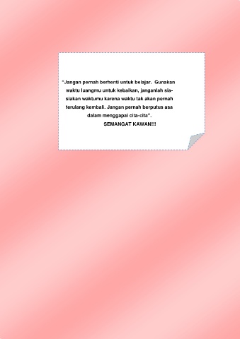 “Jangan pernah berhenti untuk belajar. Gunakan waktu luangmu untuk kebaikan, janganlah sia- siakan waktumu karena waktu tak akan pernah terulang kembali. Jangan pernah berputus asa dalam menggapai cita-cita”. SEMANGAT KAWAN!!!