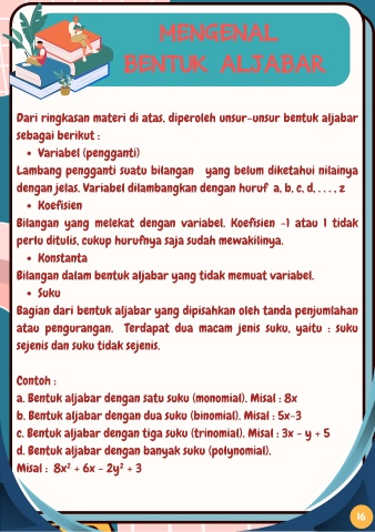 Dari ringkasan materi di atas, diperoleh unsur-unsur bentuk aljabar