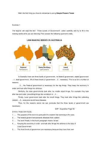 The teacher will read the text ‘ Three Levels of Government’. Listen carefully and try to fill in the