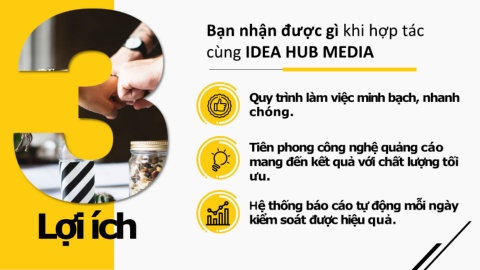 Bạn nhận được gì khi hợp tác cùng IDEA HUB MEDIA Quy trình làm việc minh bạch, nhanh chóng. Tiên phong công nghệ quảng cáo mang đến kết quả với chất lượng tối ưu. ệ thống báo cáo tự động mỗi ngày Lợiích kiểm soát được hiệu quả.
