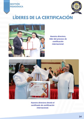 S GESTTIÓN PEDAGÓGICA LÍDERES DE LA CERTIFICACIÓN Nuestra directora, líder del proceso de certificación internacional. A Nuestra directora devela el certificado de certificación internacional. 14