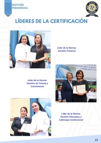S GESTTIÓN PEDAGÓGICA LÍDERES DE LA CERTIFICACIÓN Líder de la Norma: Gestión Pastoral Líder de la Norma: Gestión de Tutoría y Convivencia A Líder de la Norma: Gestión Educativa y Liderazgo institucional 17