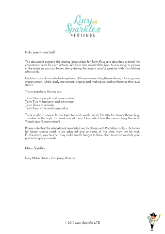 This document contains the drama lesson plans for Term Four and describes in detail the educational aims for each activity. We have also included the lyrics to any songs or poems in the plans so you can follow along during the lessons and/or practise with the children afterwards.