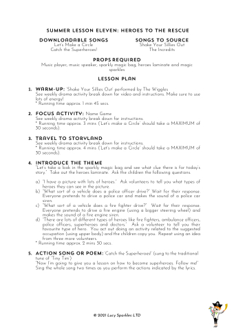 “Now I’m going to give you a lesson on how to become superheroes. Follow me!” Sing the whole song two times as you perform the actions indicated by the lyrics.