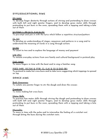 To develop finger dexterity through actions of stirring and pretending to draw crosses with both left and right pointer fingers, and to develop gross motor skills through pretending to put buns in the oven, spreading them with a topping and taking a bite out of them