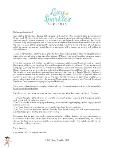This document contains all of the lesson plans for Term Four and describes in detail the educational and dance aims for each activity. We have also included MP3s and lyrics for all the action songs and poems in the plan so you can follow along during the lesson and practise with the children afterwards.