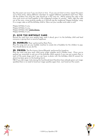 Play the track and give each child some magic sparkles and a Haribo treat. Once you’ve packed up, remember to ask one of the birthday child’s parents if you can put a party flyer in each of the party bags and if you can have a photo with the birthday child (if consent for photo has been given on the booking form).