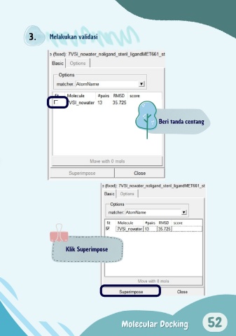 3. Melakukan validasi Beri tanda centang Klik Superimpose Molecular Docking 52 Molecular Docking