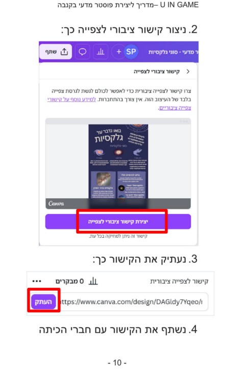 – U IN GAMEמדריך ליצירת פוסטר מדעי בקנבה .2ניצור קישור ציבורי לצפייה כך: .3נעתיק את הקישור כך: .4נשתף את הקישור עם חברי הכיתה - 10 -