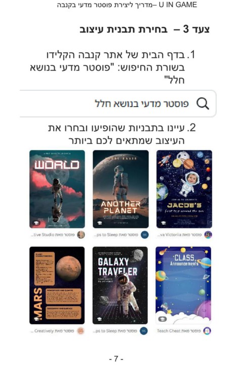 – U IN GAMEמדריך ליצירת פוסטר מדעי בקנבה צעד – 3בחירת תבנית עיצוב .1בדף הבית של אתר קנבה הקלידו בשורת החיפוש" :פוסטר מדעי בנושא חלל" .2עיינו בתבניות שהופיעו ובחרו את העיצוב שמתאים לכם ביותר -7-