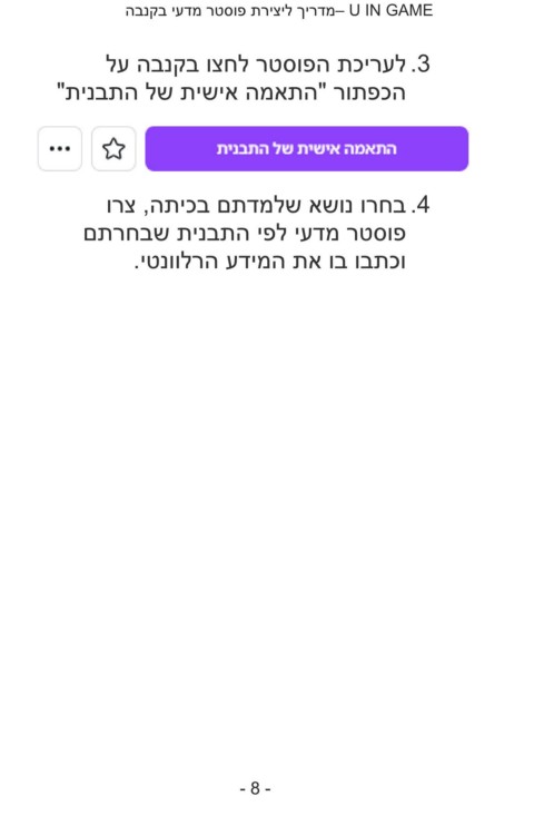 – U IN GAMEמדריך ליצירת פוסטר מדעי בקנבה .3לעריכת הפוסטר לחצו בקנבה על הכפתור "התאמה אישית של התבנית" .4בחרו נושא שלמדתם בכיתה ,צרו פוסטר מדעי לפי התבנית שבחרתם וכתבו בו את המידע הרלוונטי. -8-