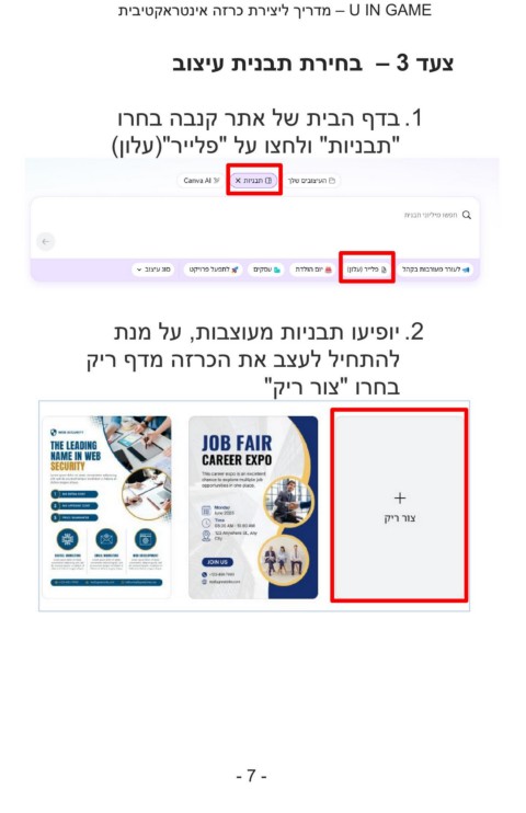 – U IN GAMEמדריך ליצירת כרזה אינטראקטיבית צעד – 3בחירת תבנית עיצוב .1בדף הבית של אתר קנבה בחרו "תבניות" ולחצו על "פלייר"(עלון) .2יופיעו תבניות מעוצבות ,על מנת להתחיל לעצב את הכרזה מדף ריק בחרו "צור ריק" -7-