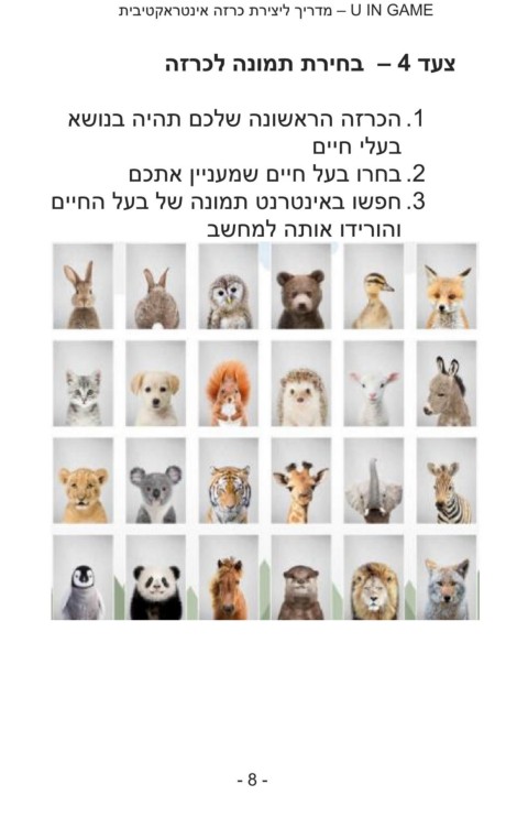 – U IN GAMEמדריך ליצירת כרזה אינטראקטיבית צעד – 4בחירת תמונה לכרזה .1הכרזה הראשונה שלכם תהיה בנושא בעלי חיים .2בחרו בעל חיים שמעניין אתכם .3חפשו באינטרנט תמונה של בעל החיים והורידו אותה למחשב -8-