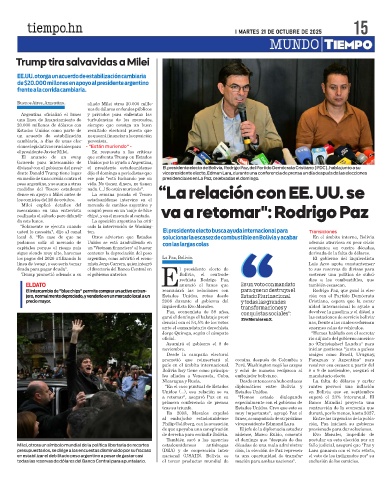 divisas) con el gobierno del presi- el presidente estadounidense El presidente electo de Bolivia, Rodrigo Paz, del Partido Demócrata Cristiano (PDC), habla junto a su