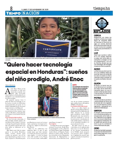 Con solo 9 años, André Enoc Mejía destaca como una promesa de la ciencia hondureña y un referente de inspiración para la niñez. Foto: a suelos del norte para su